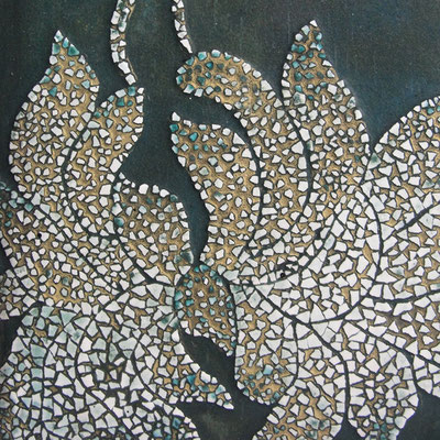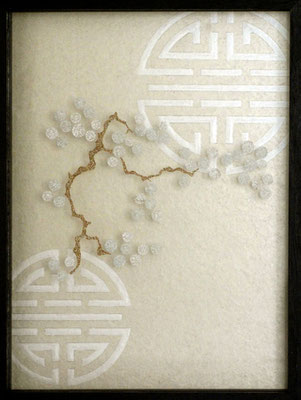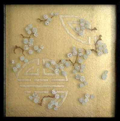 Floral decoration with eggshells on two sheets of glass. Background panel painted with the Longevity chinese ideogram. Size : 40 x 30 cm et 30 x 30 cm