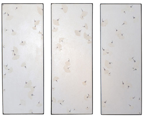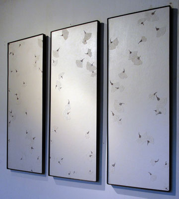 Lacquered paintings with eggshells in waxed iron frame. Sizes : 3 pannels 90 x 35 cm.